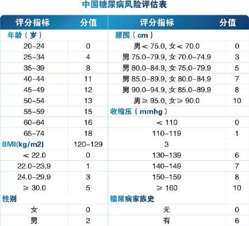 中國(guó)糖尿病風(fēng)險(xiǎn)評(píng)估表:根據(jù)下表計(jì)算分?jǐn)?shù),了解你是否有換上二型糖尿病的風(fēng)險(xiǎn),風(fēng)險(xiǎn)評(píng)估數(shù)值<25,低風(fēng)險(xiǎn);≥25,高風(fēng)險(xiǎn);