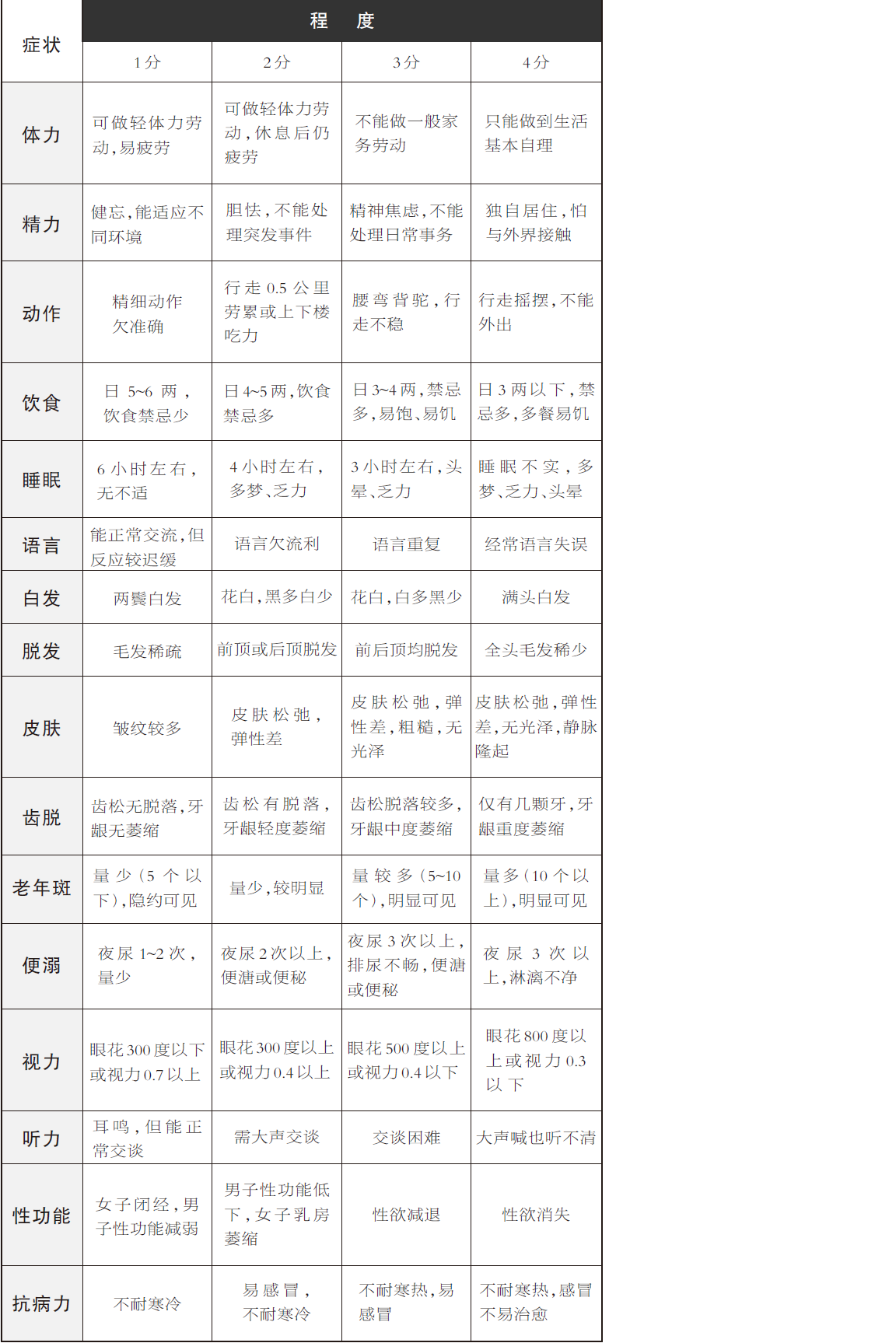 衰老會帶來一系列變化,準確判斷自己的衰老程度,能讓老人更安全、有效、科學地健身,從而達到延緩衰老、增加活力的目的。本書中的表格共有16項指標,通過評估老人的肌肉力量、皮膚狀態(tài)、平衡能力、心肺功能、認知能力等方面,將衰老程度量化為具體分數(shù),由輕到重分為1~4分,總分最高是64分。老人自測時,可將自己的情況與表中的描述一一對應,并進行打分。若總分達30分以上,則表明身體已進入老年期,總分越高衰老程度越重。